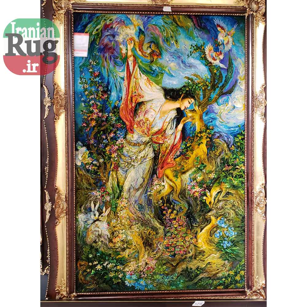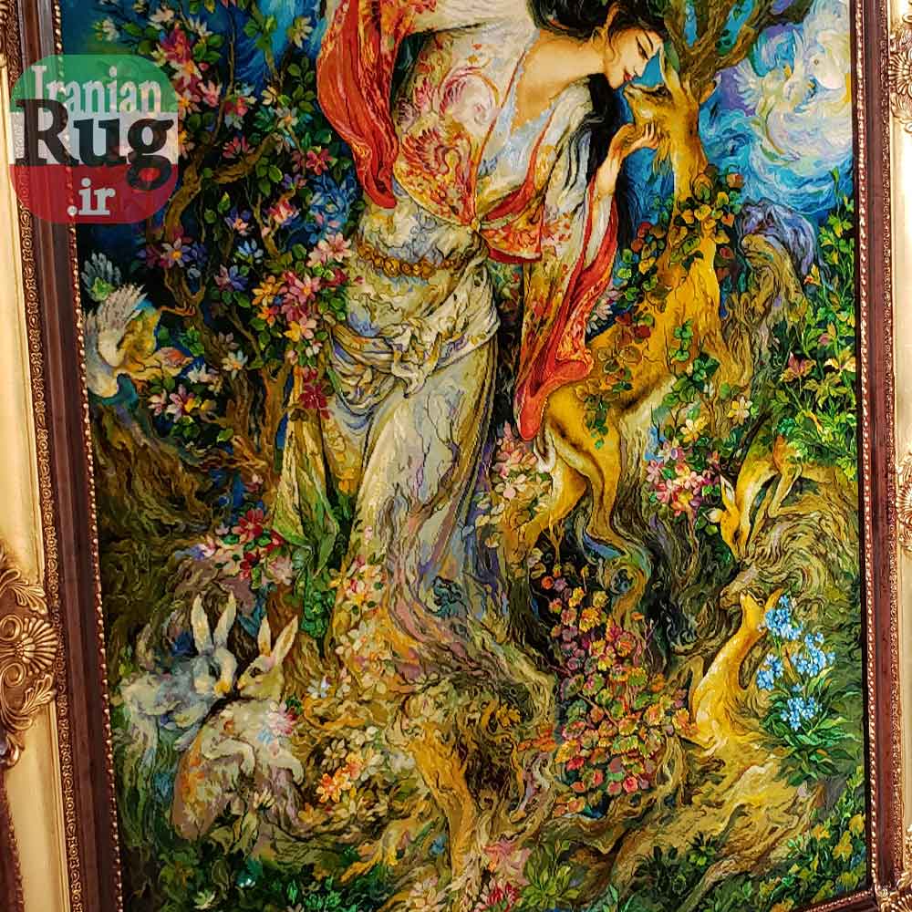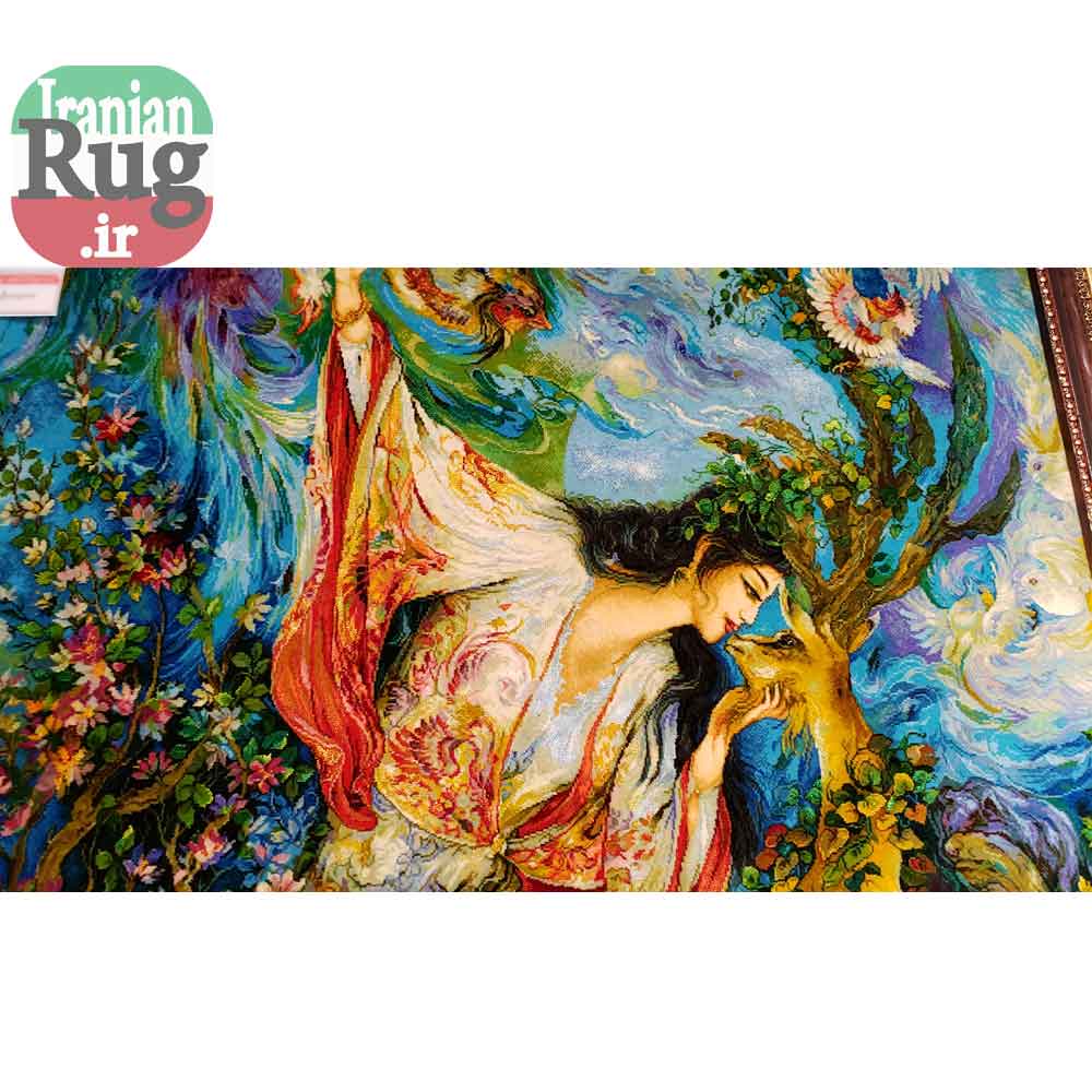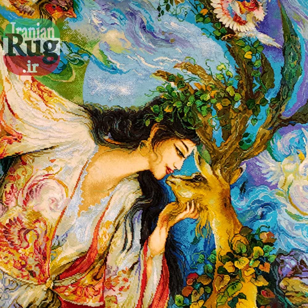 Discover the Wall Hanging Iranian/Persian Rug Tabriz miniature lady and deer 1×1.5m 3.28×4.92ft #7222. It’s a hand-woven rug based on a famous painting.